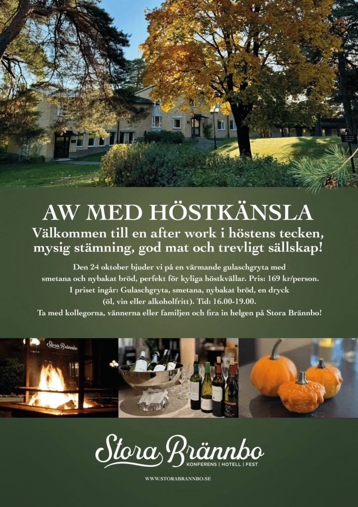 Välkommen till en after work i höstens tecken, med mysig stämning, god mat och trevligt sällskap här på Stora Brännbo. Ett perfekt sätt att avrunda veckan tillsammans med kollegor, vänner eller familj.