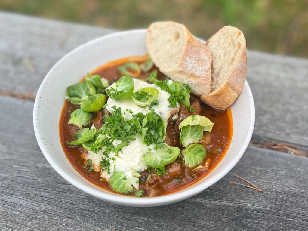Vi bjuder på en värmande gulaschgryta med smetana och nybakat bröd, serverad med en dryck (öl, vin eller alkoholfritt).